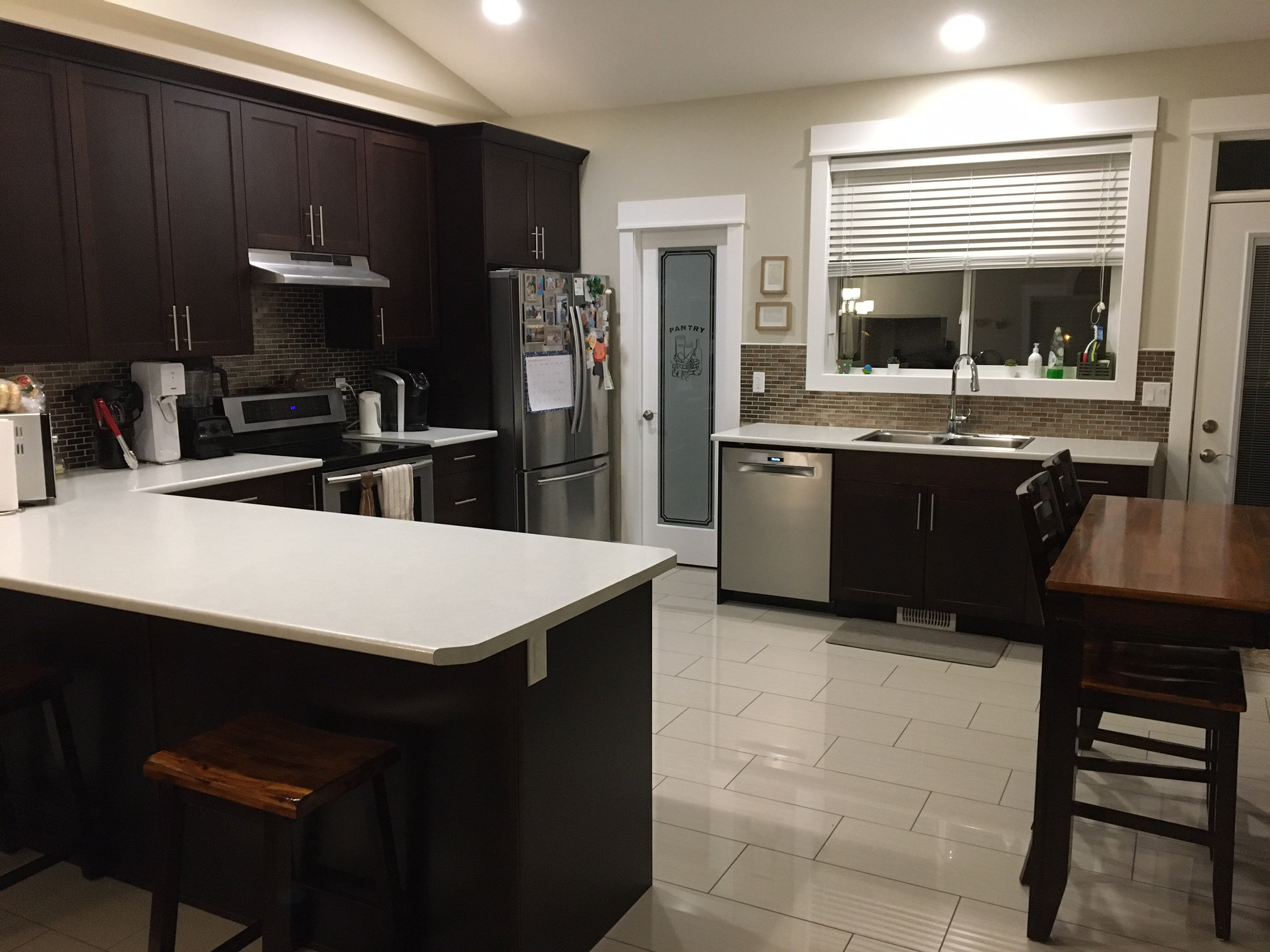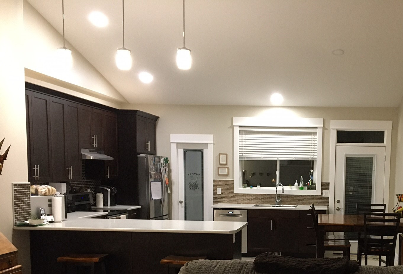 Custom tailored design plans were implemented to create a luxurious living space. We added large custom craftsman wood beams to the ceiling, designer pendants, painting cabinets, and new solid surface countertops. The fireplace got a refresh as well with new stone, and all new gas fireplace.