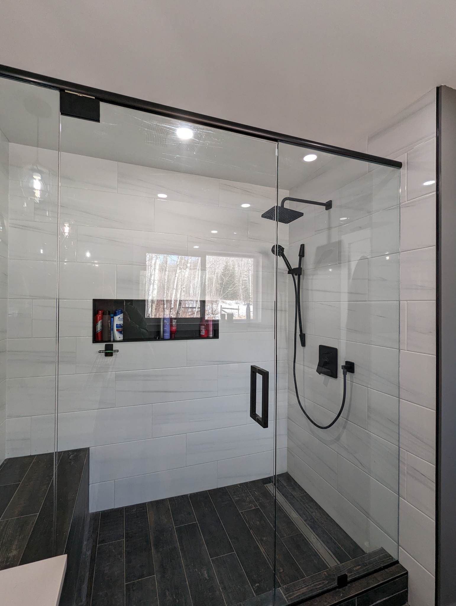 We transformed our client's bathroom into a modern oasis, complete with a sleek, white dual sink vanity, custom glass-panelled shower, and luxurious tile. The result is a space that exudes both style and functionality, where you can unwind and rejuvenate.